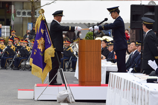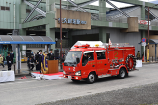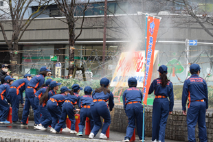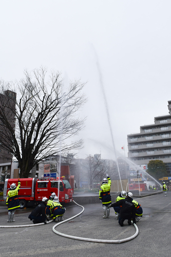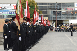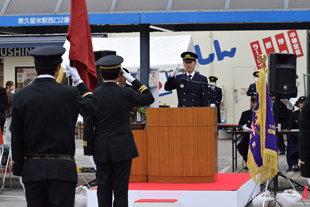1月7日に、東久留米駅西口ロータリーで、東久留米市消防団の出初式を開催しました。東久留米市を守る消防団員の勇姿を多くの皆さんにご覧いただきました。