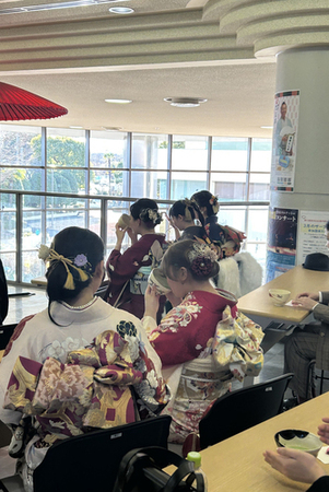式典では、各中学校の恩師からのお祝いのメッセージや市内在住の新進気鋭のピアニスト竹田悠一郎さんによるピアノ演奏、太田絢子さんによる歌唱が披露されました。また、会場2階では茶道会による抹茶席が用意され、抹茶がふるまわれました。